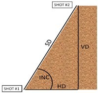 該簡單測量程序提示你對目標(biāo)進(jìn)行兩次測量: "Shot 1” 和 “Shot 2”. 圖柏斯TruPulse 利用結(jié)果計算兩點間的四個參數(shù)值: HD, VD, SD, INC.如上圖3、4所示: